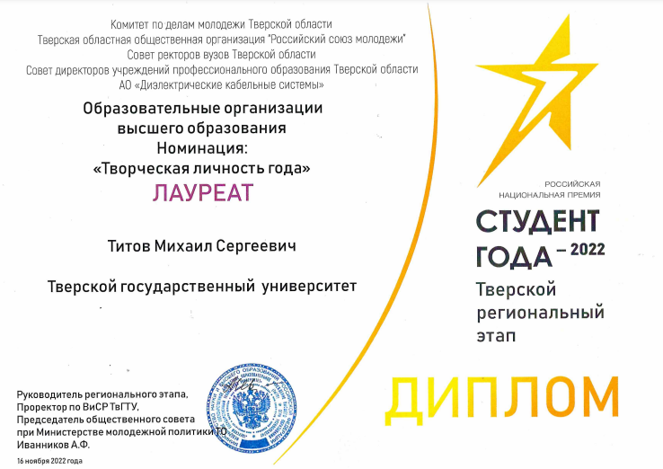 Поздравляем Михаила Титова, студента 2 курса направления "Лингвистика" с успешным участием в Тверском региональном этапе конкурса "Студент года 2022" в рамках проекта "Российская национальная премия". Михаил Титов был отмечен в номинации "Творческая личность года".