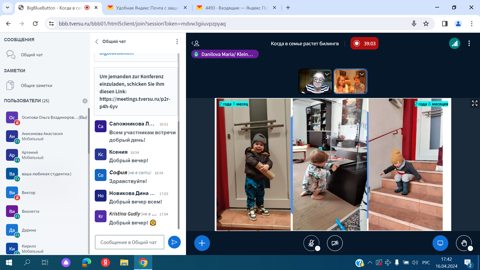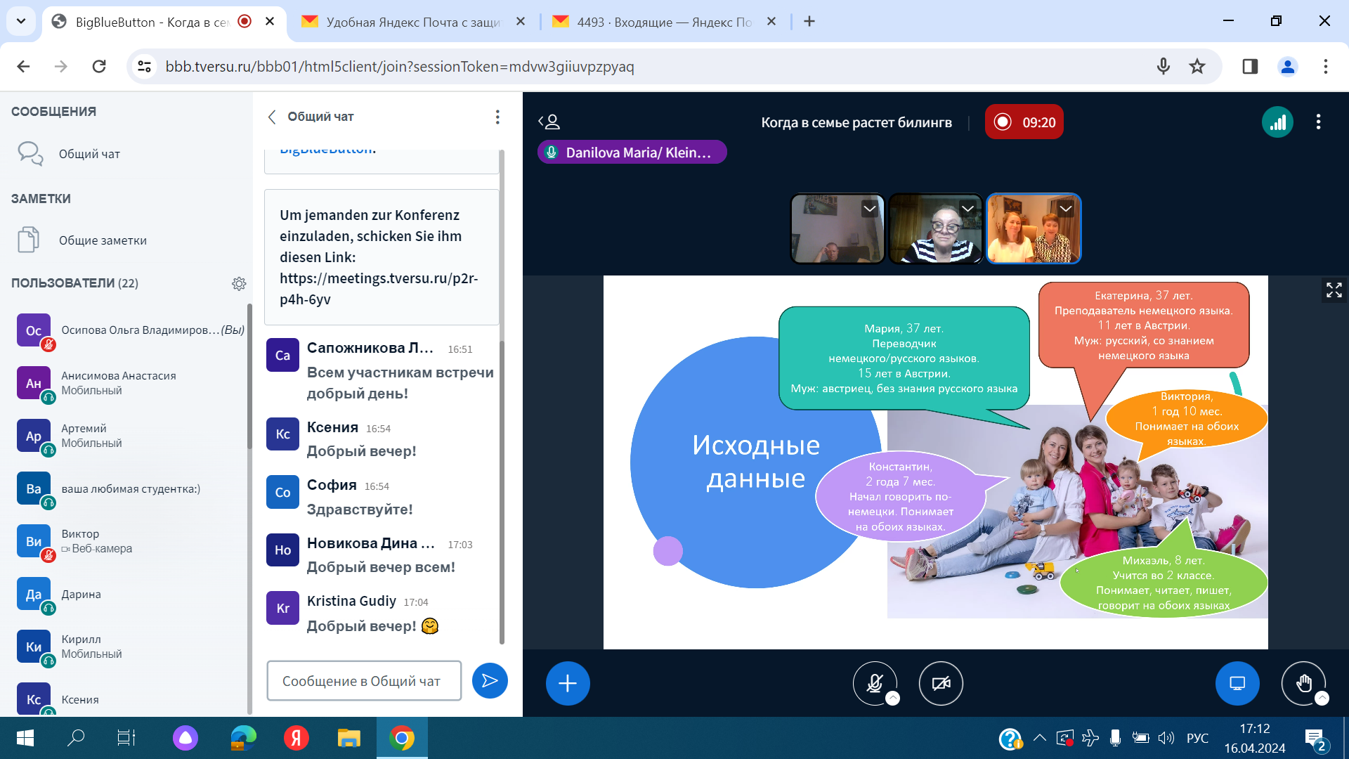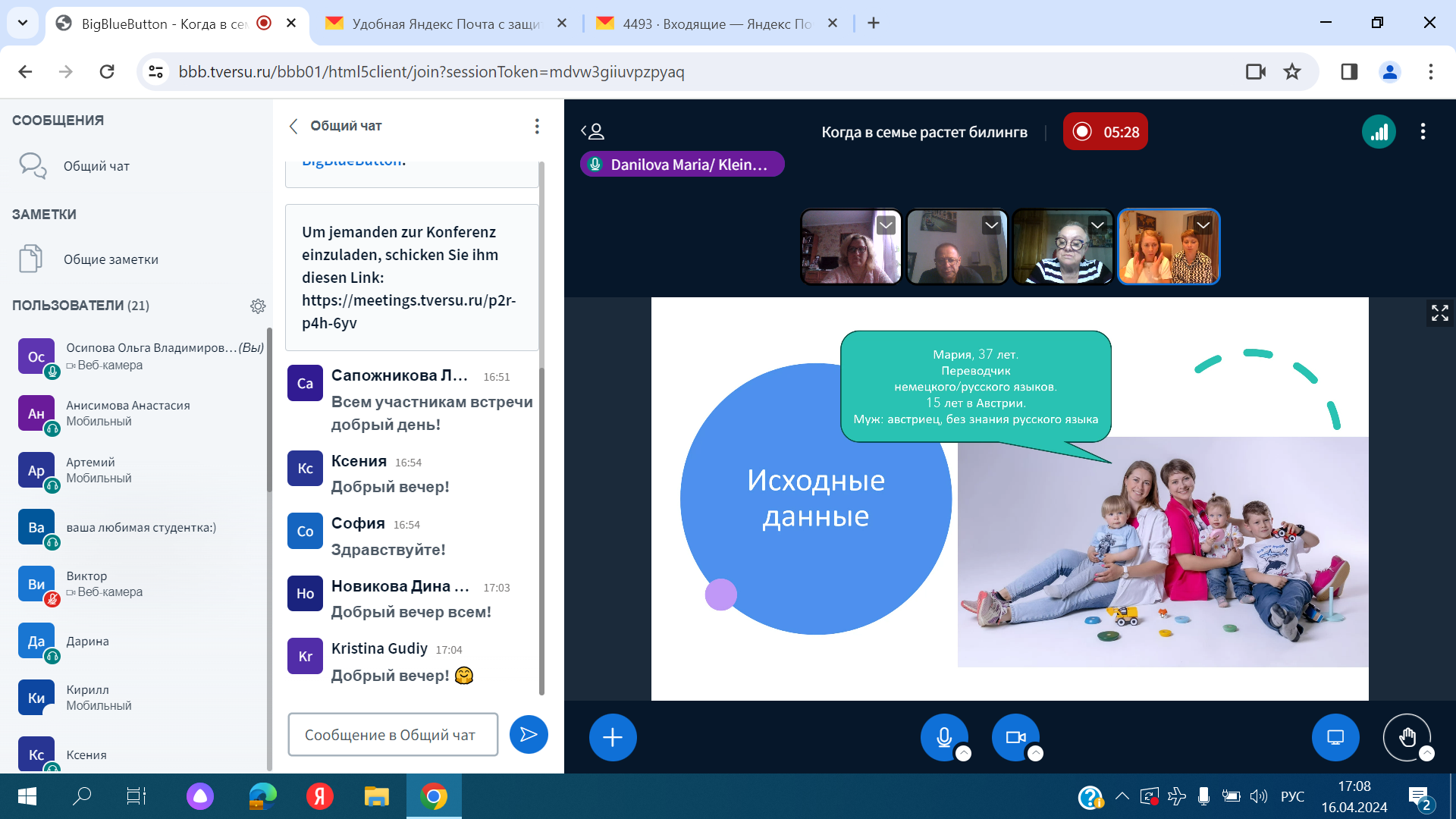 16 апреля 2024 года состоялась еще одна встреча в рамках проекта "Когда в семье растёт билингв" с Марией Даниловой, присяжным, сертифицированным судебным переводчиком немецкого и русского языков, директором переводческой фирмы LinguaXtrem, членом правления Объединения судебных переводчиков Австрии, членом ассоциации молодых предпринимателей от австрийской экономической палаты, и Екатериной Кляйн, преподавателем немецкого языка как иностранного, сертифицированным языковым тренером Австрийского интеграционного фонда, с дополнительной специализацией «обучение базовой грамотности».