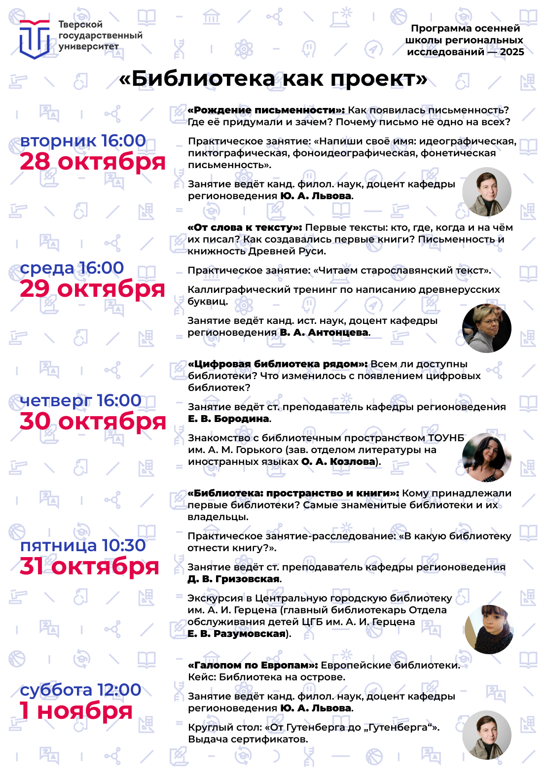 28 октября 2025 года на кафедре регионоведения стартует Осенняя школа региональных исследований "Библиотека как проект". К участию приглашаются школьники 9-11 классов и студенты. Слушателей ждут погружение в «экспедиционное обучение», позволяющее применять теоретические знания на практике; лекции ведущих преподавателей кафедры регионоведения, тренинги, экскурсии, мастер-классы, игры; тренировка востребованных навыков (критического, системного и креативного мышления, эффективной коммуникации), а также сетевое взаимодействие (школьники и студенты смогут пообщаться с экспертами, исследователями и практиками в своей области).