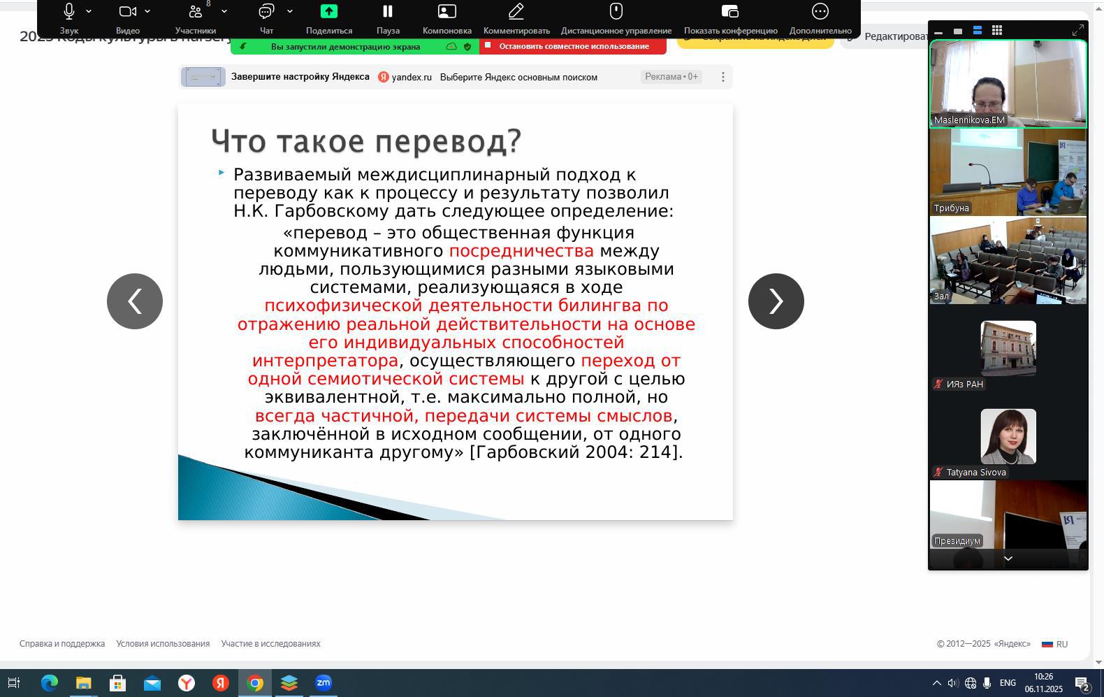 Доцент кафедру герменевтической лингводидактики и английской филологии, к.ф.н. доцент Евгения Михайловна Масленникова приняла участие в Международной научной конференции «МЕТАФОРИЗАЦИЯ И МИФОЛОГИЗАЦИЯ В ЯЗЫКЕ И КУЛЬТУРЕ», посвящённой памятной дате – 95-летию со дня рождения доктора филологических наук, профессора Вероники Николаевны ТЕЛИЯ (Институт языкознания РАН, Москва, 5-7 ноября 2025 года).