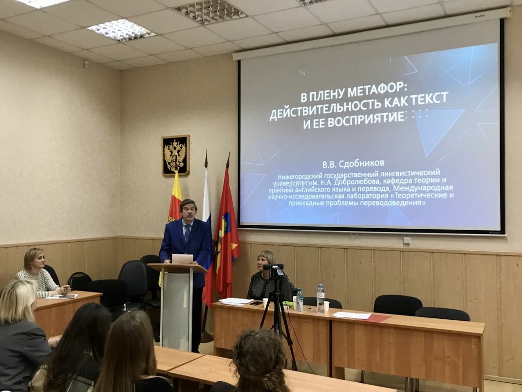 На пленарном заседании конференции выступили д.филол.наук, профессор, заведующая кафедрой герменевтической лингводидактики и английской филологии Тверского государственного университета Наталия Федоровна Крюкова; доктор филологических наук, профессор кафедры иностранных языков Московского государственного университета технологий и управления им. К. Г. Разумовского Инна Петровна Черкасова; д.филол.н., профессор кафедры теории и практики языка и теории перевода Нижегородского государственного лингвистического университета им. Н.А. Добролюбова Вадим Витальевич Сдобников; д.филол.н., профессор, заведующий кафедрой лингвистики и иностранных языков Калужского государственного университета им. К. Э. Циолковского Лев Геннадьевич Васильев.