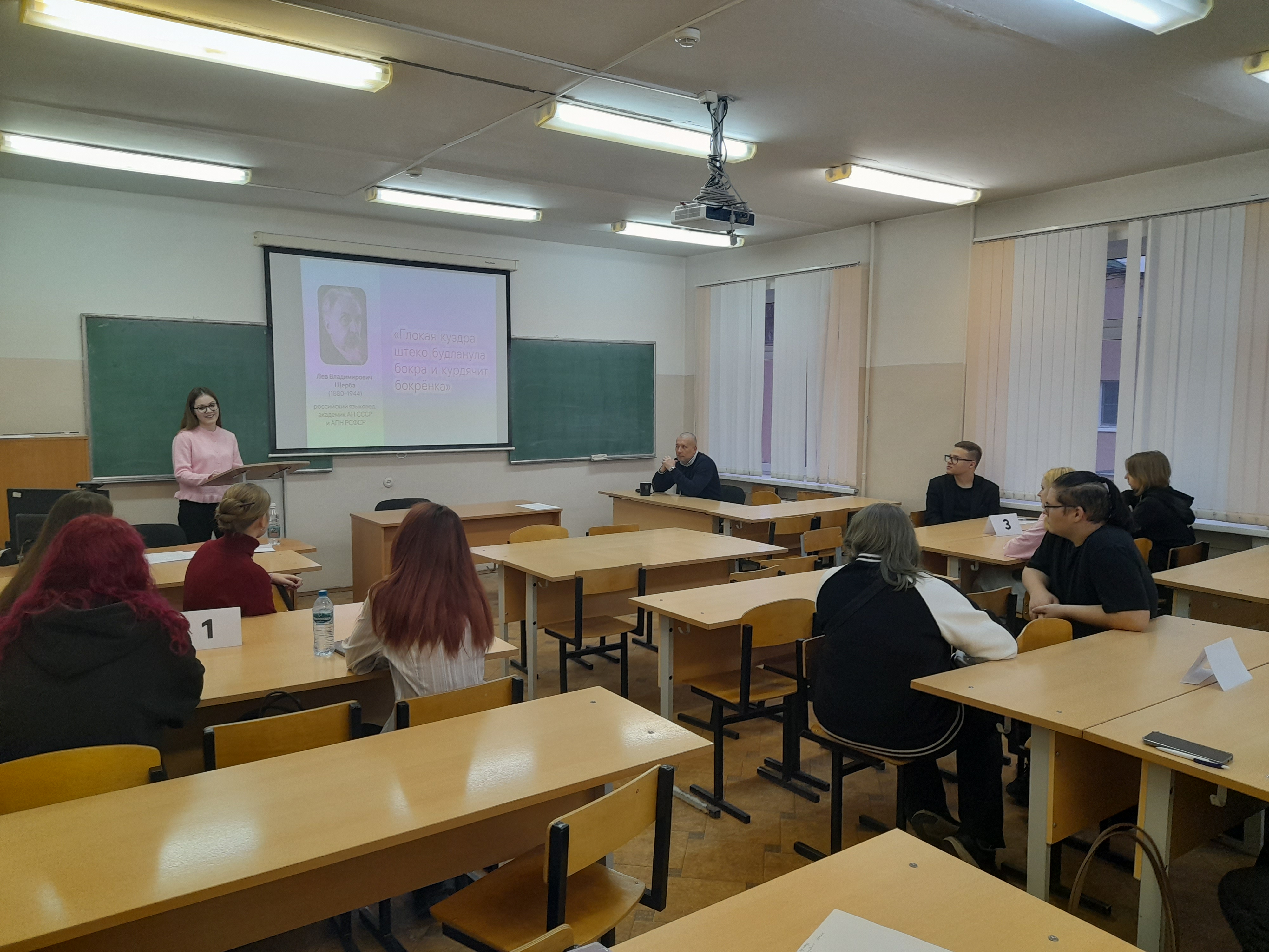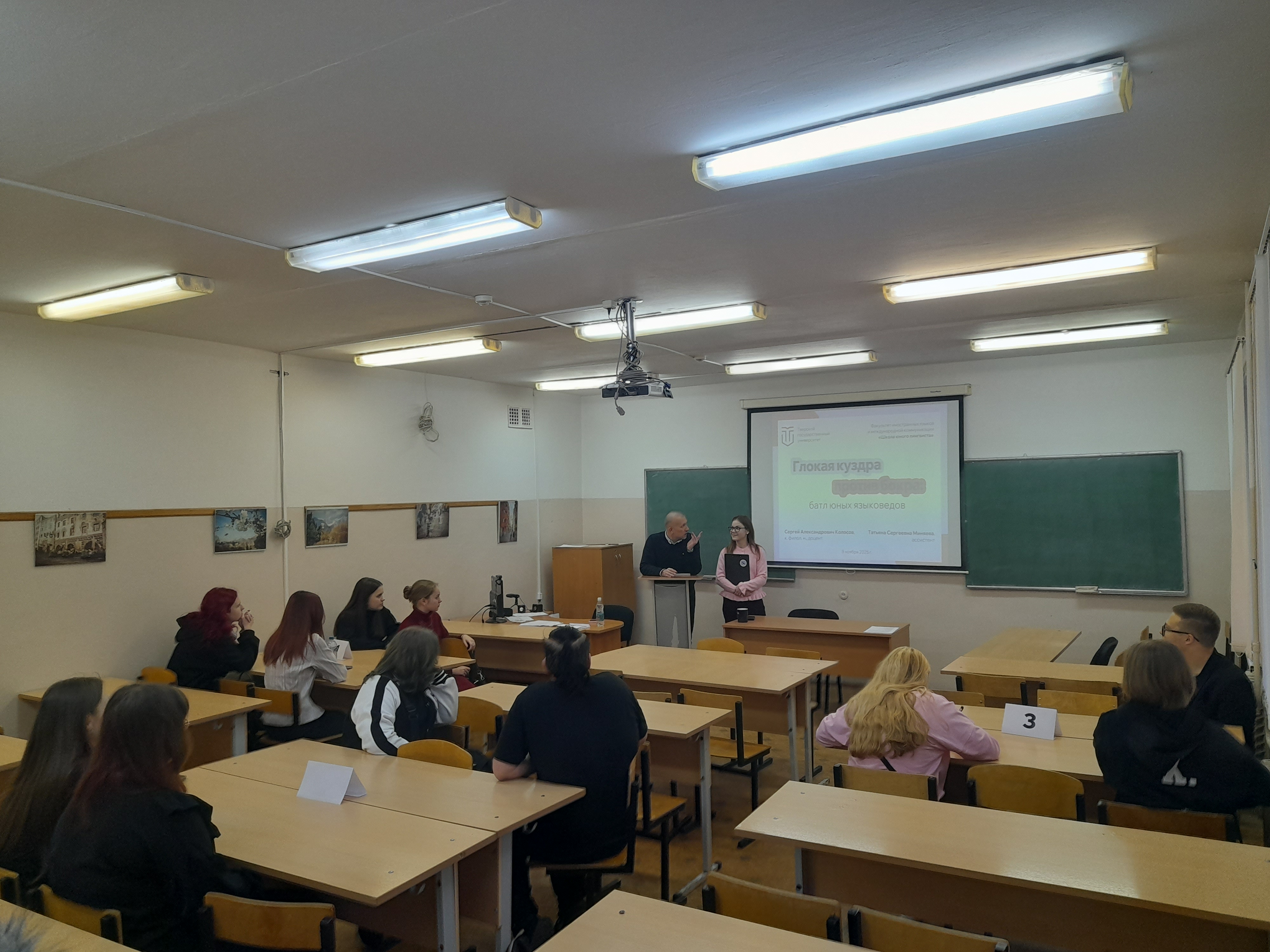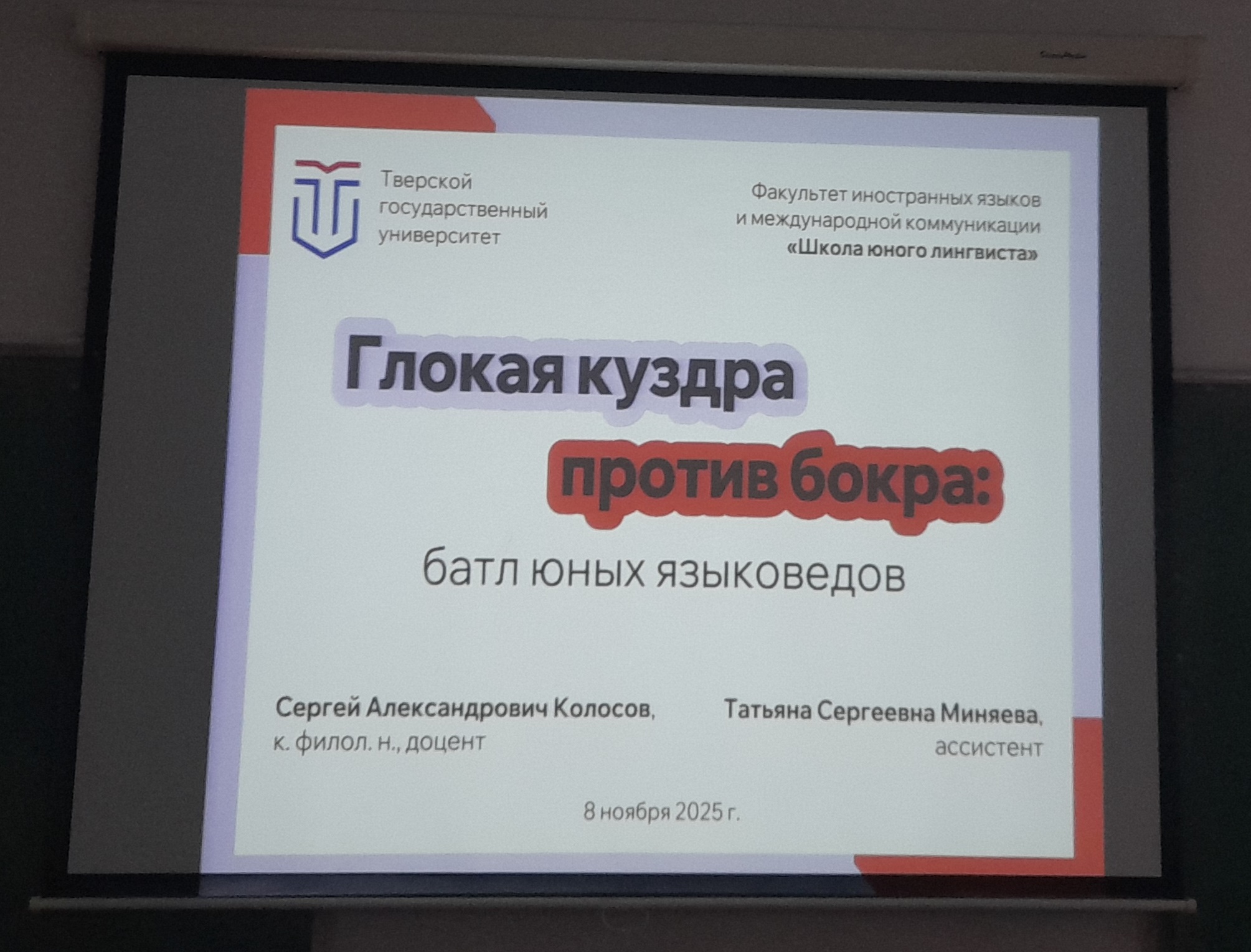 8 ноября 2025 года Школа юного лингвиста встречала старшеклассников города на занятии под загадочным названием «Глокая куздра против бокра: батл юных языковедов». Встречу провели кандидат филологических наук, доцент кафедры теории языка, перевода и французского языка Сергей Александрович Колосов и ассистент кафедры герменевтической лингводидактики и английской филологии Татьяна Сергеевна Миняева. Слушатели Школы не только познакомились с российским языковедом Львом Владимировичем Щербой, но и приняли участие в командном соревновании и узнали ответы на множество вопросов, например: